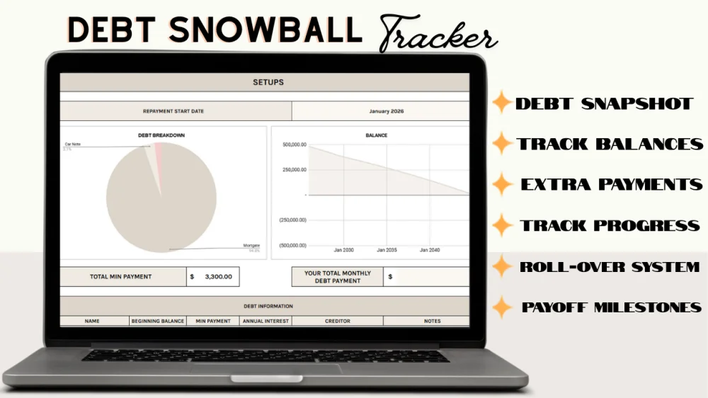 The Debt Snowball Tracker is designed to help you get out of debt without feeling overwhelmed or confused about where your money is going.